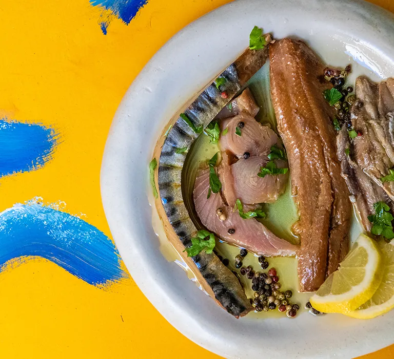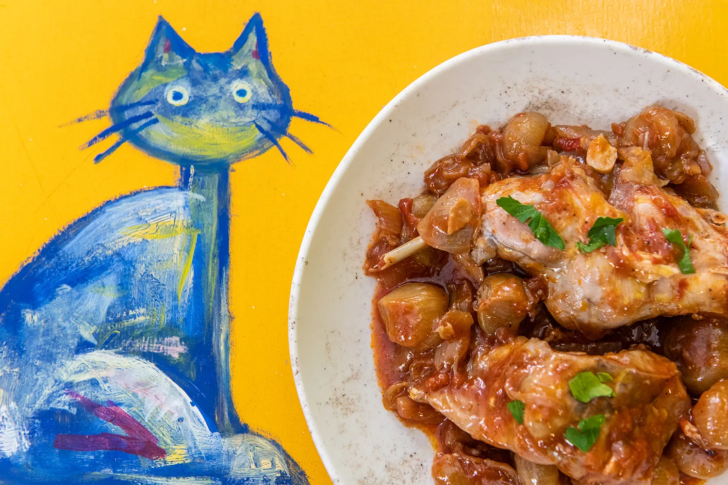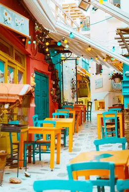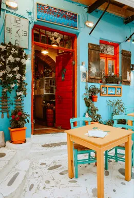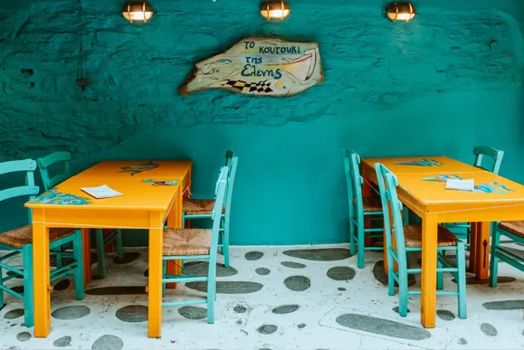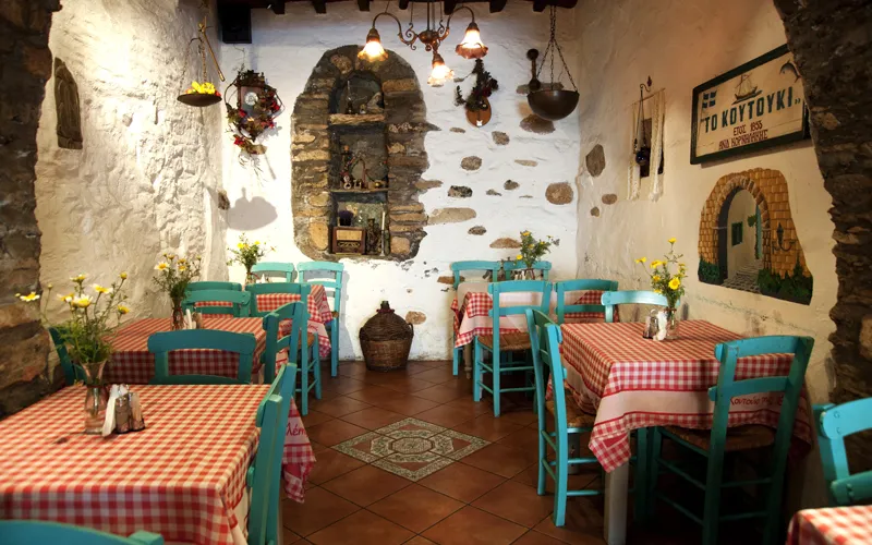 Ένα οινομαγειρείο του 1812 γεμάτο αναμνήσεις και μυρωδιές, σταθμός γεύσης και έμπνευσης περιηγητών και συγγραφέων, περιμένοντας το καΐκι για το επόμενο νησί. Οι τοίχοι σκιάζονται από φιγούρες γερόντων με τραγιασκάκια που κρατούν καλαθάκια με προμήθειες.