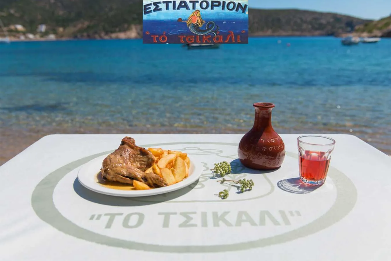 Οι θαμώνες εδώ είναι τακτικοί και πολύ από αυτούς γευμάτιζαν στο «Τσικάλι» από την εποχή που αυτό ήταν προσβάσιμο μόνο από τη θάλασσα. Ξέρουν ότι εδώ θα γευτούν το υπέροχο κατσικάκι κατσαρόλας με κρασί και άνηθο, το ριγανάτο κουνέλι, το γεμιστό χοιρινό φούρνου με τυρί, ντομάτα και πιπεριά και τους παραδοσιακούς ρεβυθοκεφτέδες, καπαροσαλάτα, μελιτζανοσαλάτα, ρεβυδάθα ξυλόφουρνου.