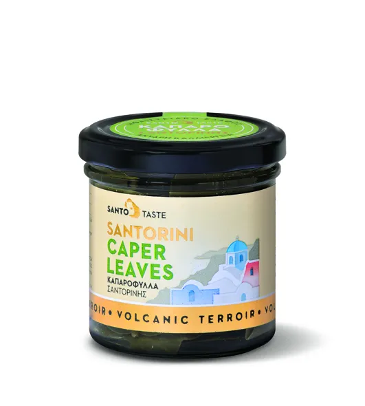 Από την άγρια κάπαρη που φυτρώνει ανάμεσα στις ηφαιστειακές πέτρες και τις ξερολιθιές της Σαντορίνης, συλλέγουμε ξεχωριστά τα φύλλα που έχουν πιο κομψή και πιο διακριτική γεύση κάπαρης. Η κάπαρη και τα φύλλα της είναι πλούσια σε βιταμίνες του συμπλέγματος Β και αντιοξειδωτικά.