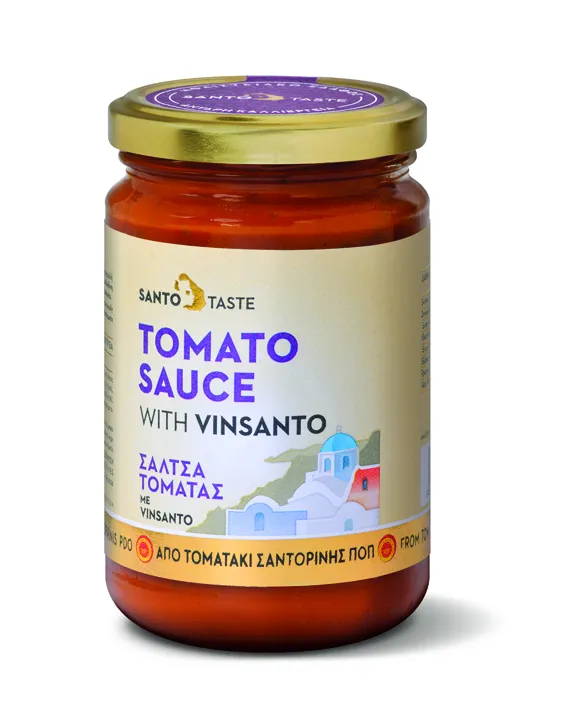 Συστατικά: Χυμός από Τοματάκι Σαντορίνης, πολτός από Τοματάκι Σαντορίνης διπλής συμπύκνωσης, Vinsanto, εξαιρετικό παρθένο ελαιόλαδο, κρεμμύδι, σκόρδο, μαϊντανός, βασιλικός, καρυκεύματα. Χωρίς συντηρητικά.