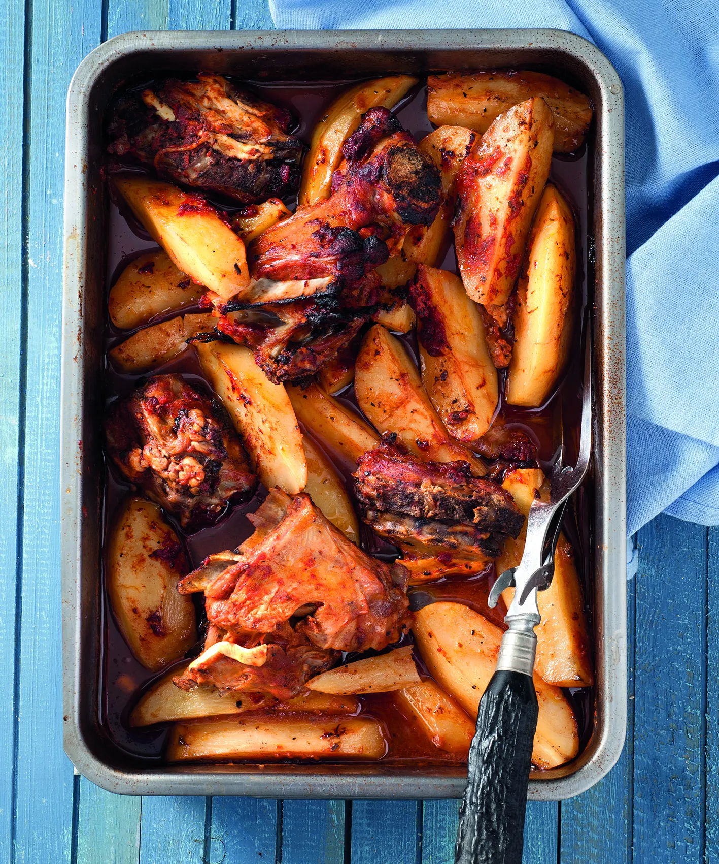 αφήνουμε να μαριναριστεί για 6-8 ώρες. Βάζουμε σε ένα βαθύ ταψί το κρέας, τις πατάτες, κομμένες κυδωνάτες, το ελαιόλαδο και νερό τόσο όσο να τις καλύψει. Ψήνουμε σε προθερμασμένο, στους 180°C, φούρνο