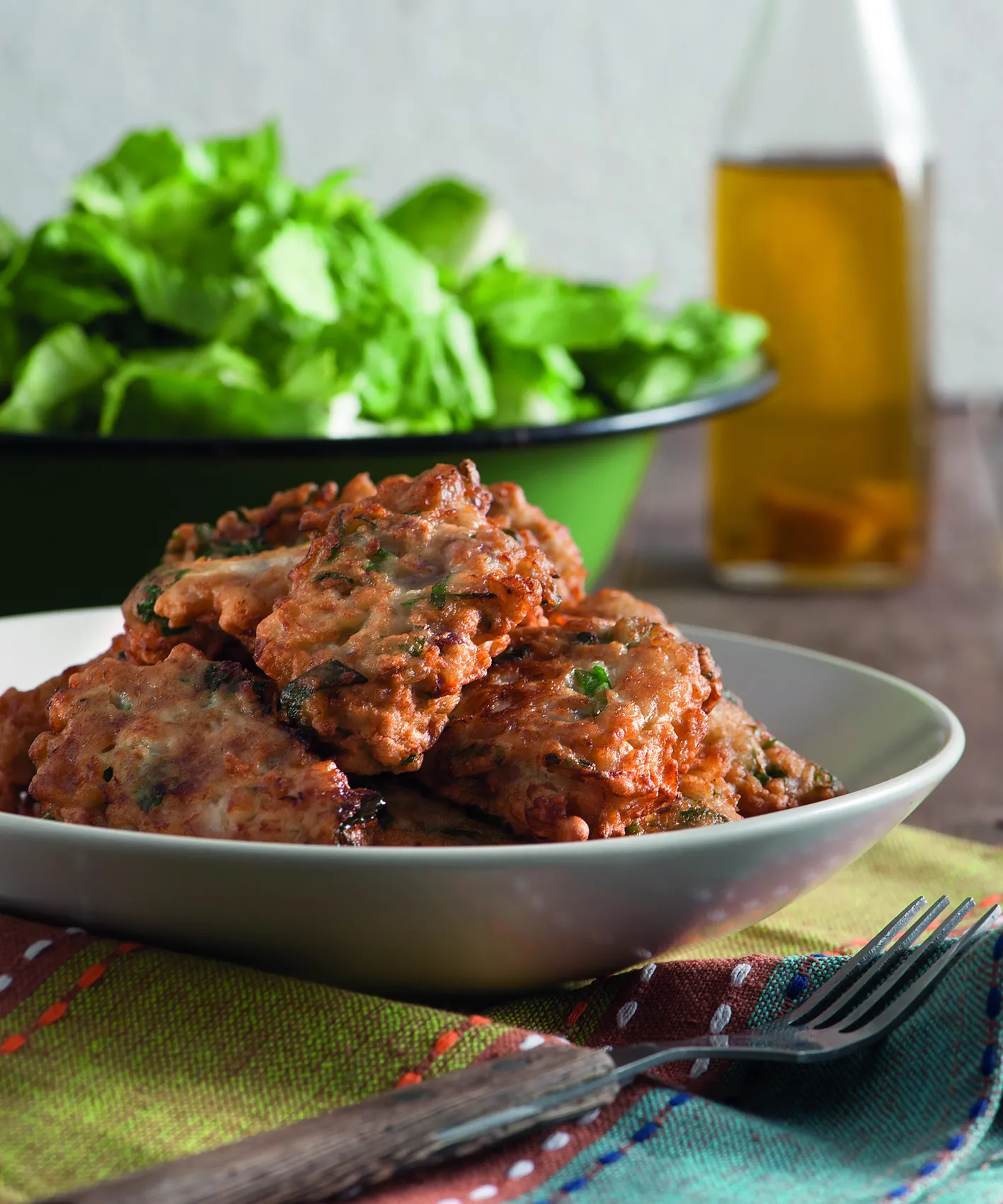 Καθαρίζουμε τα κρεμμύδια και τα τρίβουμε στον χονδρό τρίφτη. Προσθέτουμε το αλεύρι, καλά κοσκινισμένο, τα αυγά, αλάτι, πιπέρι και τα μυριστικά και ανακατεύουμε καλά. Ζεσταίνουμε το ελαιόλαδο σε ένα φαρδύ και βαθύ τηγάνι και ρίχνουμε κουταλιές από το μείγμα, φροντίζοντας να μη ρίξουμε πολλές ταυτόχρονα για να μην πέσει η θερμοκρασία του