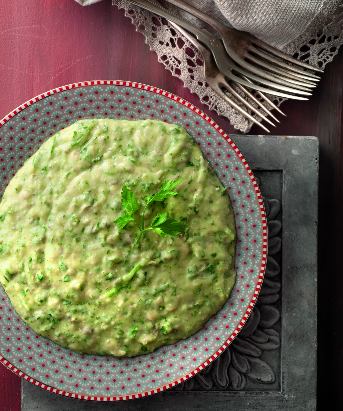 Πολτοποιούμε στο μπλέντερ τον μαϊντανό, το κρεμμύδι και την κάππαρη. Προσθέτουμε το ψωμί, την πατάτα, το ξίδι, το σκόρδο, τον χυμό λεμονιού, το αλάτι, το πιπέρι και το ελαιόλαδο.