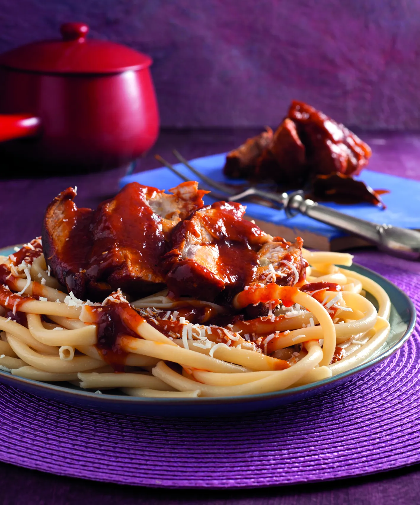 Μπορούμε αντί για μακαρόνια να ρίξουμε στην κατσαρόλα πατάτες κομμένες κυδωνάτες, που θα έχουμε τηγανίσει προηγουμένως ελαφρά σε ελαιόλαδο και θα τις αφήσουμε να «τραβήξουν» τη σάλτσα σε σιγανή φωτιά μέχρι να μαλακώσουν. Για αυτή την ποσότητα υπολογίζουμε 4 μεγαλούτσικες πατάτες.